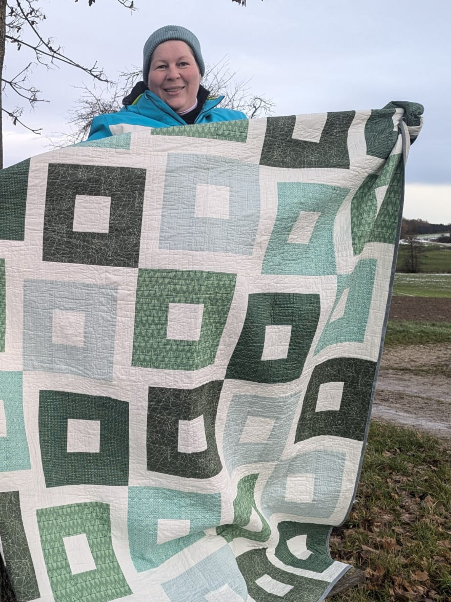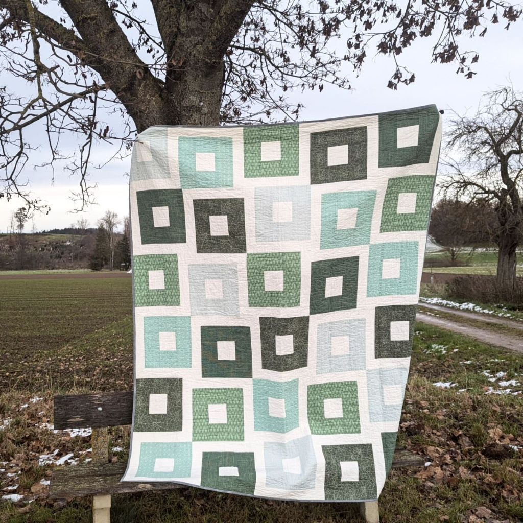 Werbung ohne Auftrag. Letztes Jahr habe ich bei Tik Tok einige tolle Quiltdesigns gesehen. Grüntöne mag ich aktuell richtig gerne und daher habe mich ein Design, das eben auch in diesen Farben gehalten war, für mich adaptiert.