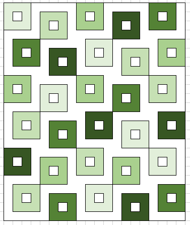 Links der ursprüngliche Entwurf, rechts dann das finale Layout. Ich habe den Quilt ganz bewusst „In the Sticks“ genannt, erinnern mich die weißen Flächen zwischen den grünen Quadraten an verschlungene (Wald)Wege und die Farbflächen an Felder, wie man sie aus der Vogelperspektive erkennen kann.
