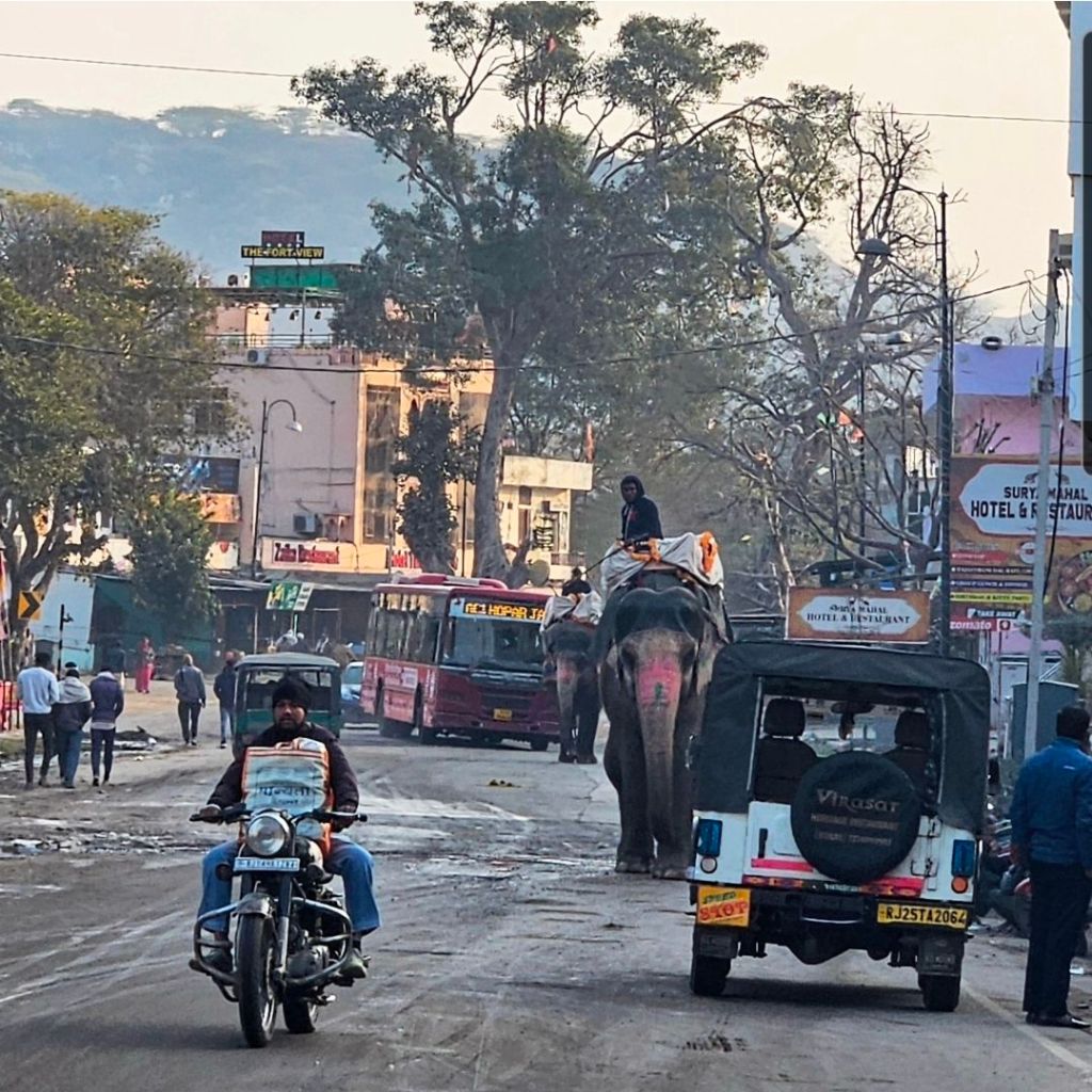 Typische Verkehrskonstellation hier in Indien – Elefanten treffen auf Motorräder, Autos und TukTuks.