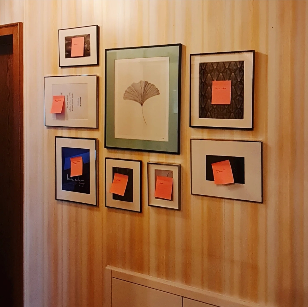 Jetzt muss ich noch warten, bis ich alle Bilder zusammen habe [meine Schwestern möchte ich jeweils mit Partnern und / oder Kindern abgebildet haben, von Eltern, meiner Oma und meinen Freundinnen müssen die Bilder erst noch entstehen] und diese dann entsprechend bearbeiten. Gegebenenfalls will ich nämlich noch die Farben etwas vereinheitlichen, damit die Gallery Wall dann wirklich stimmig aussieht. Dank Post its weiß ich auch, welches Bild ich wohin haben möchte.