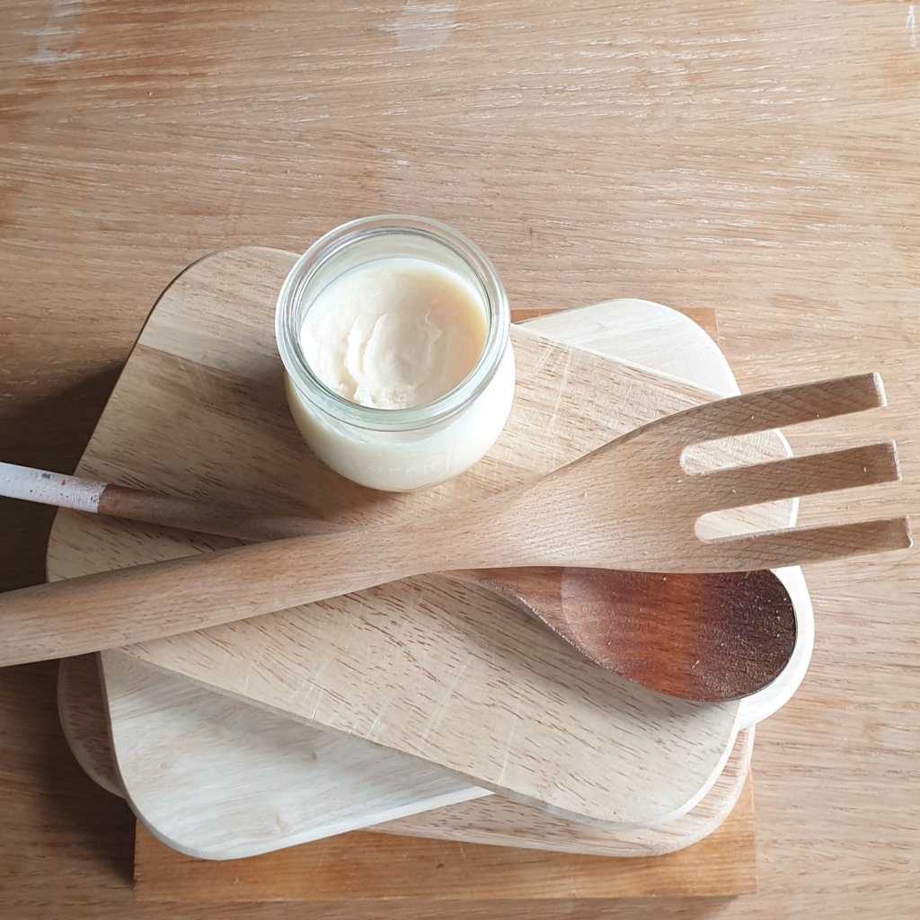 Ähnlich wie Marit wollte ich mir nicht erst was im Internet bestellen und so holte ich mir eine 100% Bienenwachskerze aus dem nächsten Drogeriemarkt. Kokosöl hatte ich eh schon zu Hause. Schnell ein Wasserbad aufgesetzt, ein Glas reingestellt und los gings: 1 Teil Bienenwachs und 3 Teile Kokosöl rein ins Glas, im siedenden Wasserbad schmelzen und gründlich verrühren. Ganz simpel und ohne schädliche Zutaten wie etwa Mineralöl! Nach dem Abkühlen habe ich mir meine zu behandelnden Holzutensilien geschnappt und die Board Butter gründlich darauf verteilt. Dabei nicht zu viel verwenden, es sollen sich ja schließlich keine klebrigen Schichten bilden. Am besten macht ihr das abends, lasst Eure Kochlöffel etc. über Nacht liegen und poliert am nächsten Morgen mit einem sauberen Tuch die nicht eingezogenen Überstände weg. Ein schöner Nebeneffekt ist natürlich auch, dass ihr damit Eurer Haut auch etwas Gutes tut. Ich steh ja total auf Natürliches, deswegen habe ich Euch auch in den nächsten Tagen einige Blogposts zum Thema natürliche Pflege selbst machen…..