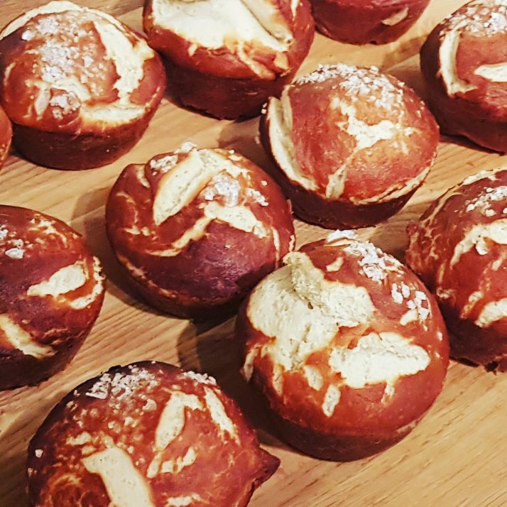 Den Ofen vorheizen(Umluft 180 ° C), während die Lauge vorbereitet wird. Dazu 1,5 l Wasser aufkochen. Da das Natron stark aufschäumen wird, am Besten einen hohen Topf verwenden. Natron hinzugeben. 2 bis 3 Teiglinge gleichzeitig in die Lauge geben – hierbei vorsichtig arbeiten, da diese sehr ätzend ist. Die Teiglinge ca. 30 Sekunden im Laugenbad lassen, währenddessen mit einem Schaumlöffel wenden, damit alle Seiten mit der Lauge benetzt werden. Mit dem Schaumlöffel herausheben, abtropfen lassen und zurück in das Muffinblech geben. Sofort mit Salzflocken oder Saaten bestreuen. Wenn alle Teiglinge bestreut sind, im Ofen 15 – 20 Minuten backen.
