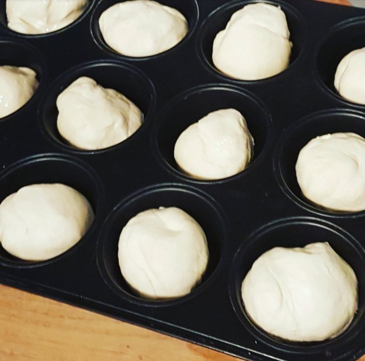 Um schön gleichmäßige Brötchen zu erhalten, habe ich mein Muffinblech geölt und den Teig in 12 Portionen geteilt. Diese zu Kugeln formen und im Blech gehen lassen. Dies dauerte etwa 45 Minuten.