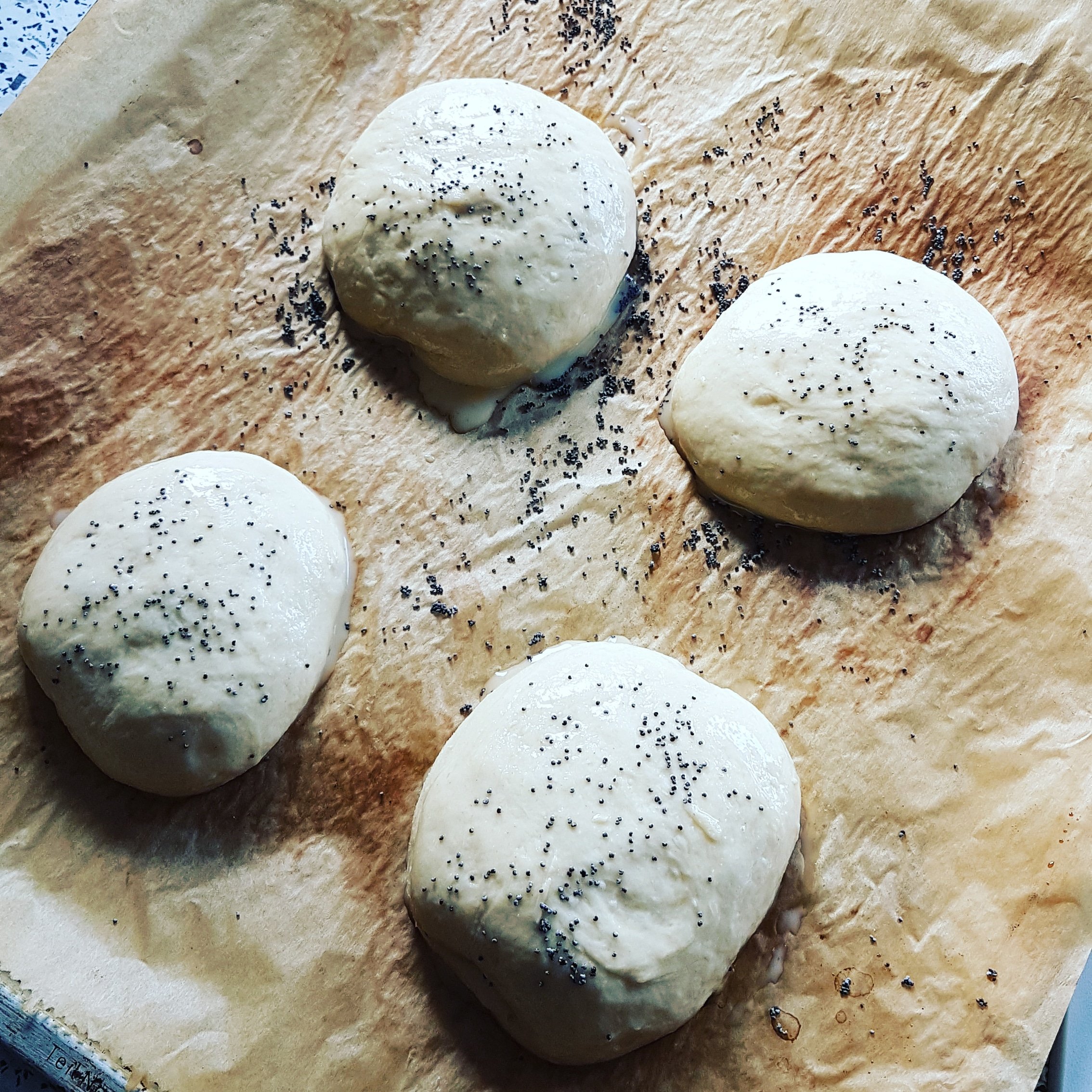 4. Nun ca. 12 Buns formen (dazu am besten die Hände etwas mehlen) und auf ein mit Backpapier ausgelegtes Backblech legen. Wenn man nicht möchte, dass die Buns zusammen backen, bitte auf entsprechend Abstand achten und ggf. ein zweites Blech verwenden. Nun nochmal eine Stunde gehen lassen.