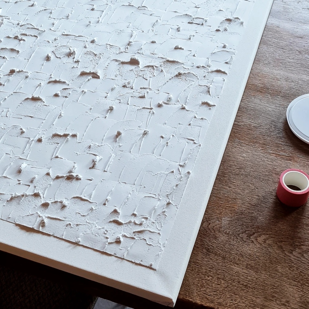 Zuerst den Keilrahmen ringsum mit Washitape abkleben, damit ein glatter Rand entsteht. Die Spachtelmasse relativ willkürlich mit der Spachtel auftragen. Tape abziehen und die Masse gut trocknen lassen. Sprühfarbe in mehreren dünnen Schichten auftragen und mehrere Stunden trocknen lassen. Mit Wasserwaage und Bleistift die Kreuzungspunkte anzeichnen und zwei kleine Nägel in die Wand schlagen. Aufhängen und freuen.