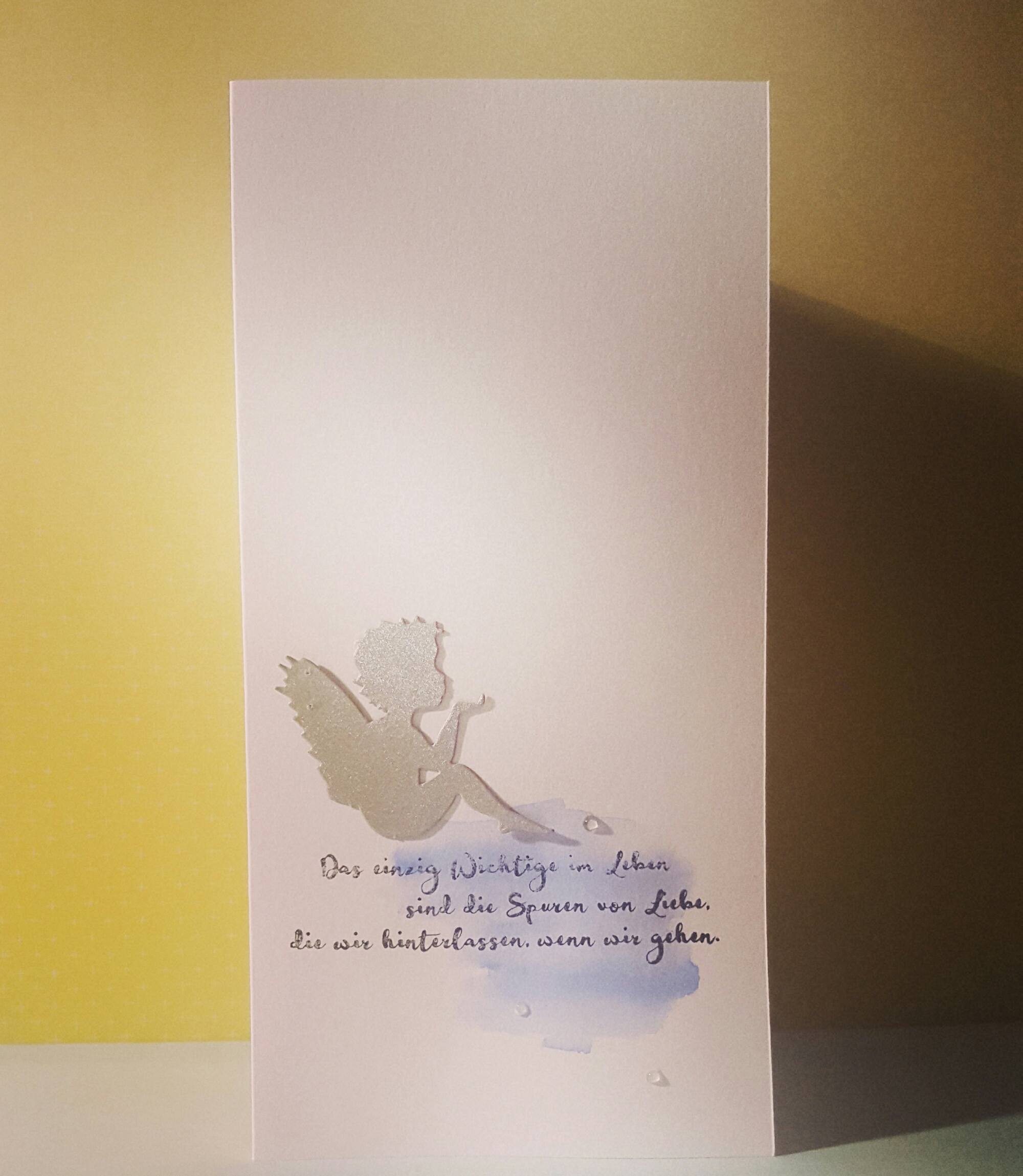 Den Schriftzug habe ich silbern foliert [Minc] und dann mit der BigShot und einer Die von KesiArt ausgestanzt. Der pistazienfarbene Rahmen ist ein Papier von Stampin‘ Up! mit eingeprägter Struktur.