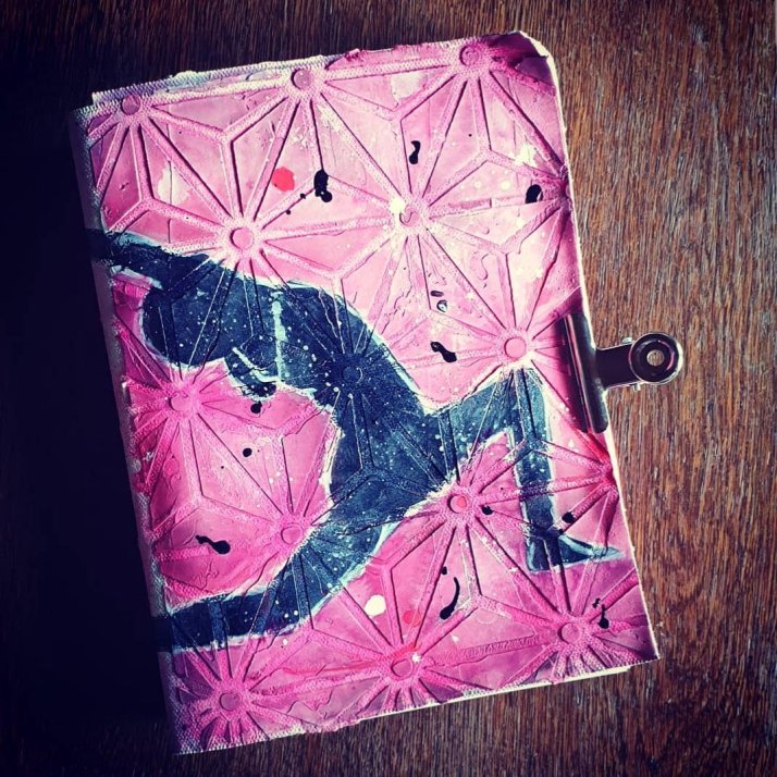 Den Hintergrund habe ich mit einer Stencil von Nat und Strukturpaste gestaltet. Dazu kam dann Farbe solange, bis mir der Hintergrund gefiel und die Figur habe ich mit Schablonen von Donna Downey gestaltet. Im gesamten Buch finden sich die selben Farben wie auf dem Cover; die Texte schreibe ich mit irRESISTible von Tsukineko. Noch ist das Buch nicht komplett gefüllt, aber ich arbeite häufig daran.