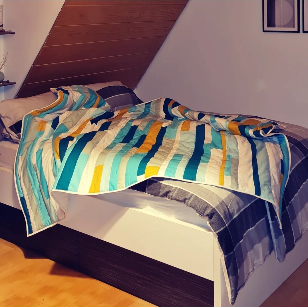 Genau meine Farben und schön schlicht. Einfach das Richtige für eine Anfängerin in Sachen Quilting, wie ich es damals war. Ich hatte bis dahin nur einen einzigen Quilt genäht [wie ich eben sah, muss ich diesen auch mal noch verbloggen…]. Die Stoffe habe ich damals, also geschätzt 2014/15, anhand des Bildes bei Quilt & Textilkunst in München gekauft.