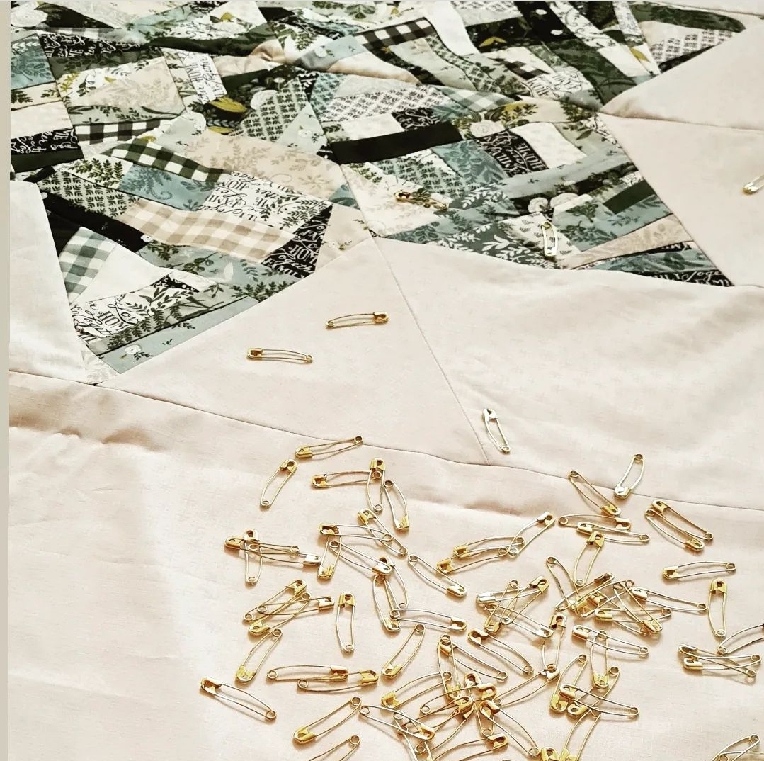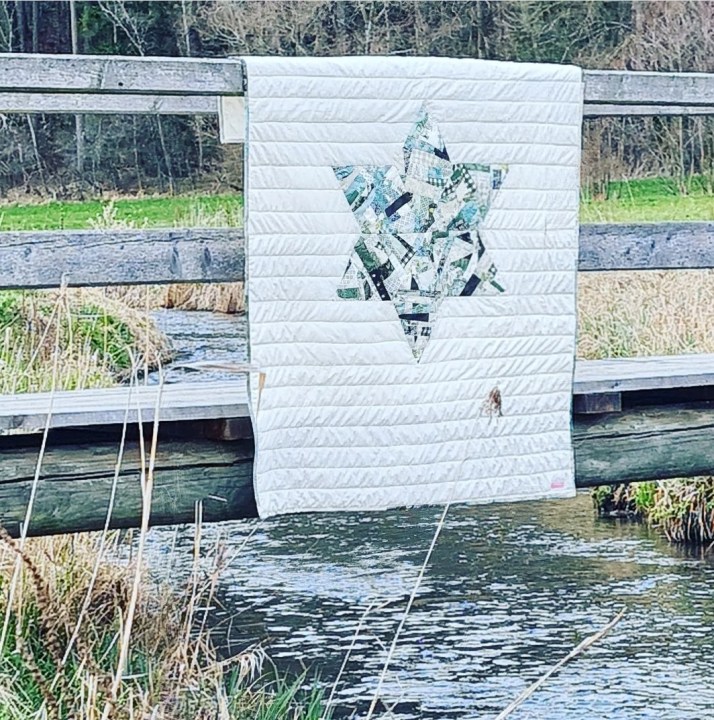 Dann durfte der fertige Quilt mit mir raus in die freie Wildbahn. Die Fotos habe ich dieses Mal im Holzlager meines Dads gemacht. Aktuell versuche ich nämlich tatsächlich, ganz verschiedene Hintergründe und Orte für meine Bilder auszusuchen. Meist bin ich ja allein unterwegs, um Bilder zu machen und da ist es gar nicht so einfach, die großen Flächen schön in Szene zu setzen und gleichzeitig die Muster erkennbar zu zeigen. Die dunkle Jahreszeit macht es auch nicht einfacher, wenn dann am Wochenende ggf. das Wetter dann auch nicht mitspielt, dann ist das alles doppelt doof.