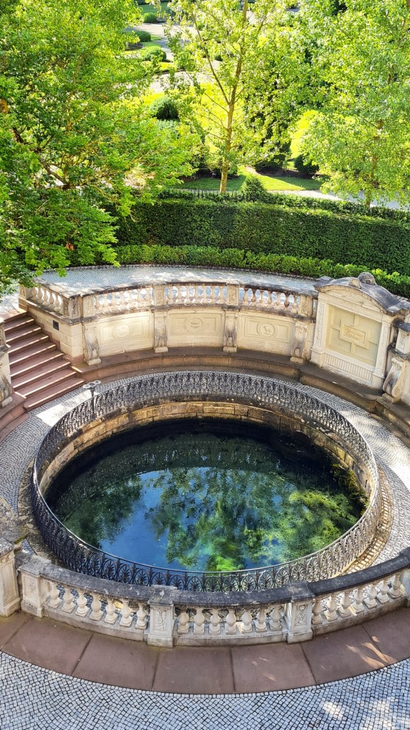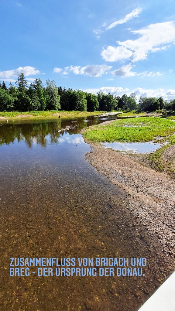 Ausgehend vom Startpunkt vor der Fürstlich Fürstenbergischen Brauerei begleitet uns dieses Logo und weist uns den Weg an der Donau entlang. Wir besuchen natürlich die Quelle im Schlosspark, auch wenn erst knapp 2 km später offiziell die Donau entsteht. Mittlerweile ist es kurz vor 10.00 Uhr. Wir cremen uns dick mit Sonnenschutz ein und machen uns auf die Reise Richtung Schwarzes Meer. Tatsächlich sehr interessant: neben der Mosel ist die Donau der einzige Fluss Deutschlands, der von der Mündung flussaufwärts gemessen wird – so ist die Quelle sozusagen das Ende der Donau.