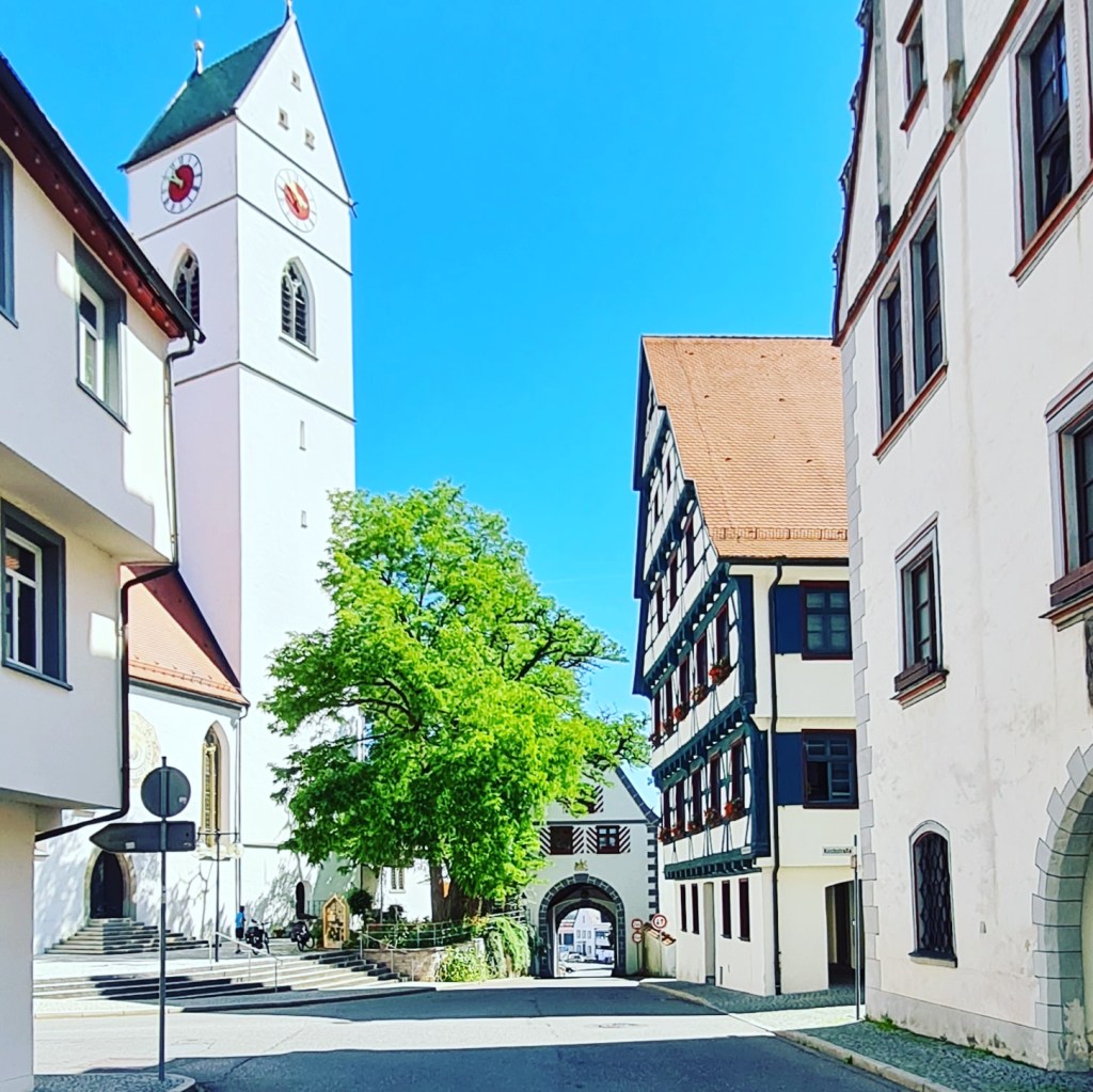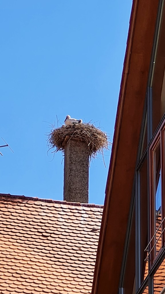 Rund um Riedlingen gibt es wahnsinnig viele Störche- das letzte Mal sah ich 2009 im März in Spanien eine vergleichbare Anzahl. Wir verließen den Donauradweg, um gemütlich durch die historische Altstadt zu bummeln und etwas Pause zu machen. Hier finden sich viele mittelalterliche Fachwerkbauten im schwäbisch-fränkischen Stil. Auf der Alb wird die alamannische Fastnacht begannen und so findet sich an einem damaligen Kornspeicher sogar eine geschnitzte Narrenmaske im Fachwerk. Auf vielen Dächern kann man Storchennester finden und jetzt im Frühsommer sind auch die Jungvögel gut zu sehen.
