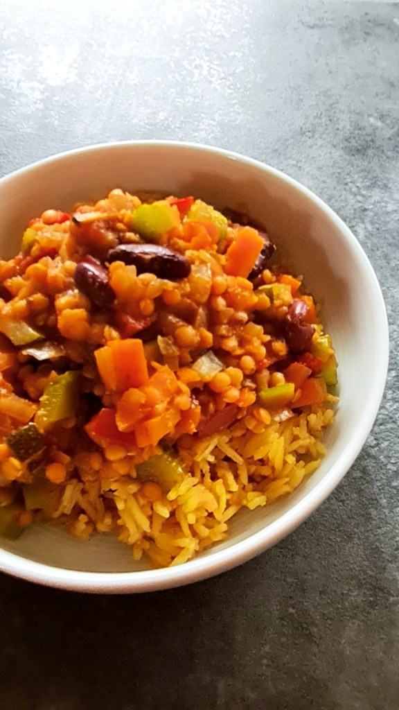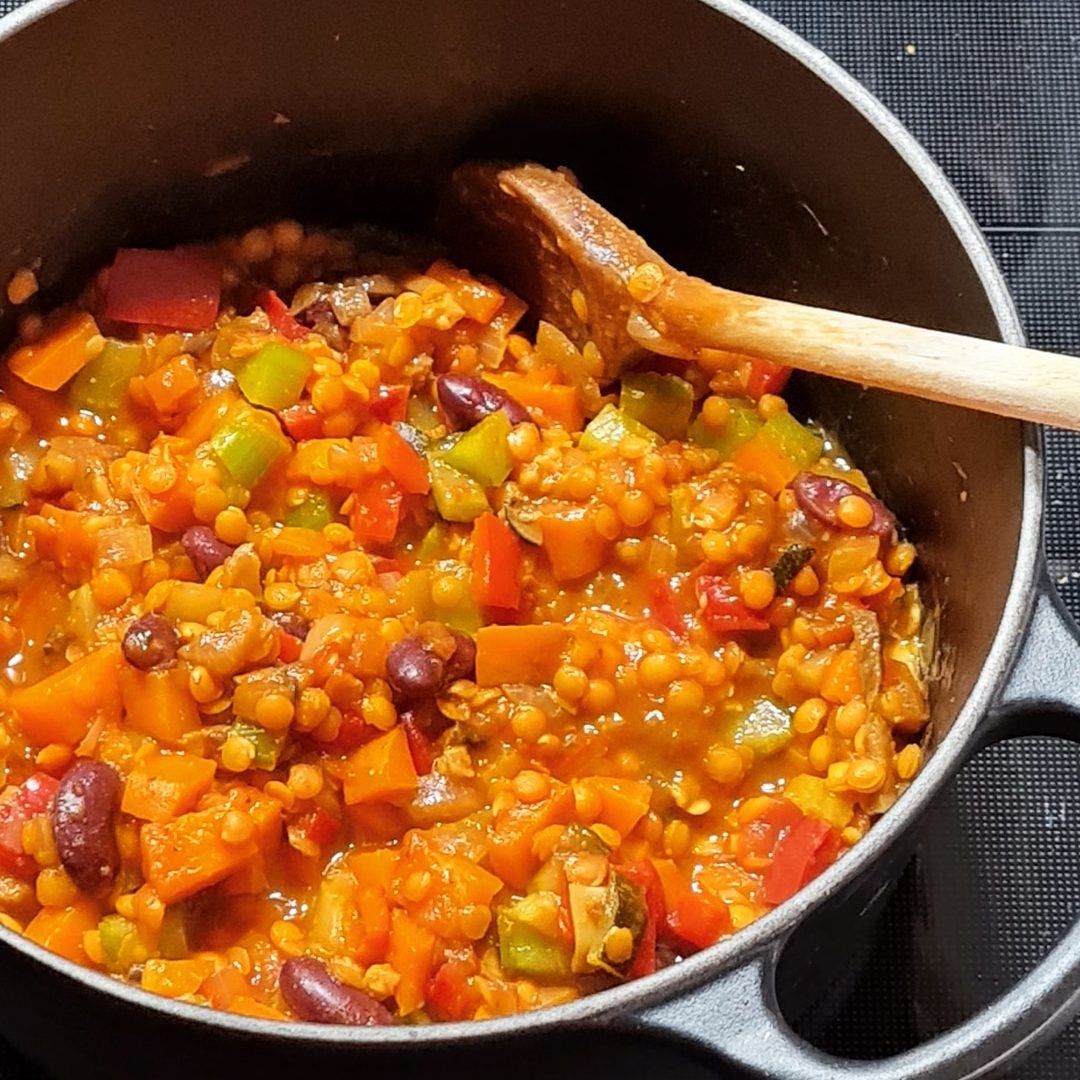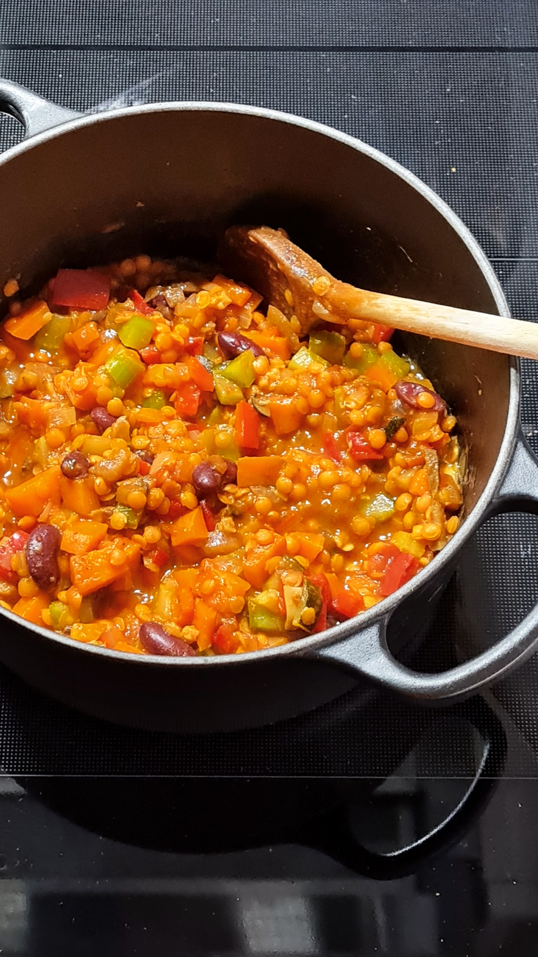 Im Moment vergeht keine Woche, in der ich nicht irgendwas mit Linsen zubereite. Hauptsächlich kommen gelbe und rote Linsen in meine Töpfe; in der Regel indisch abgeschmeckt. Hier habe ich einfach so ziemlich alles an Gemüsen hergenommen, was zur Verfügung stand und zu einer Suppe verarbeitet.